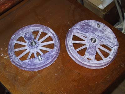 |   For finishing the half patterns they were paired together with two bolts so that the allignment of the spokes on the parting plane could be checked. To ensure aligment a file was used! The pattern for the coupled wheel on the left and the pattern for the driving wheel on the right. |